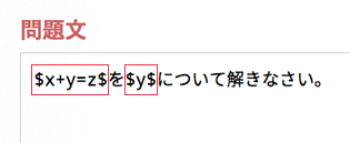 問題編集画面では,数式や記号がコマンド入力された状態の テキストが表示されます。 このテキストを編集することで,お望みの数式を出力できます。 |